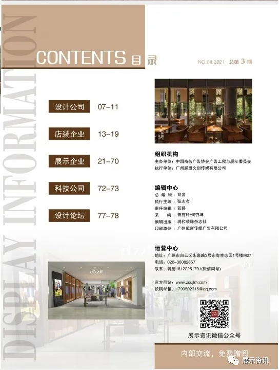 《展示资讯》是展示道具领域唯一的刊物,自创刊以来得到了业内众多企业的支持,本期刊物是“中国商务广告协会广告工程与展示委员会”作为主办单位出版的新一期刊物,在此特向一直支持协会工作的企业表示感谢!“散”是展示道具行业的现状,《展示资讯》意在把分散在全国各地的道具工厂及产业链做一个系统化的展示。首先是建立一个内部资源交流互动的渠道,高效联结上下游产业链,并配合线上平台《店陈网》www.zsdjlm.com逐步向外延伸,使更多人了解展示道具行业,同时为需求方提供更多的选择。随着时间的推移,将会极大提升展示道具行业的知名度及曝光率。